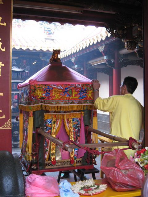 而媽祖的神轎就在一旁 有人正在整理中
